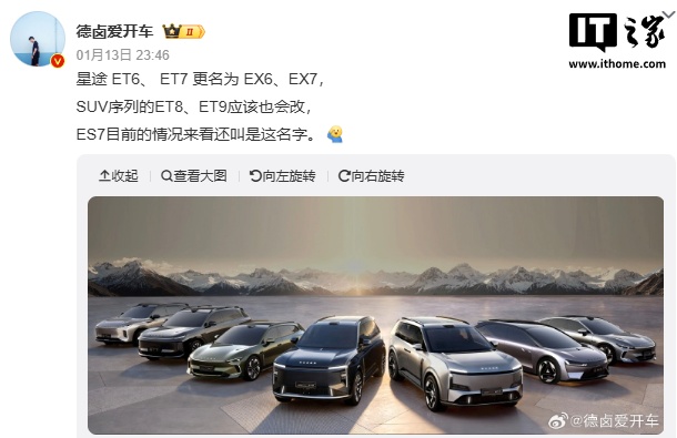 IT之家详实到,博主 @德卤爱开车 于本年 1 月发文分解,星途 ET6、 ET7 改名为 EX6、EX7。