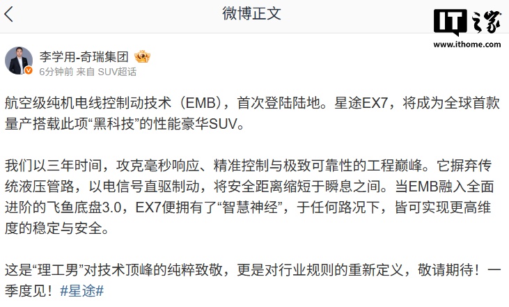 IT之家 2 月 7 日音问,奇瑞汽车施行副总裁李学用当天告示,航空级纯机电线为止动技巧(EMB),初度登陆陆地。星途 EX7,将成为天下首款量产搭载此项“黑科技”的性能豪华 SUV,一季度见。