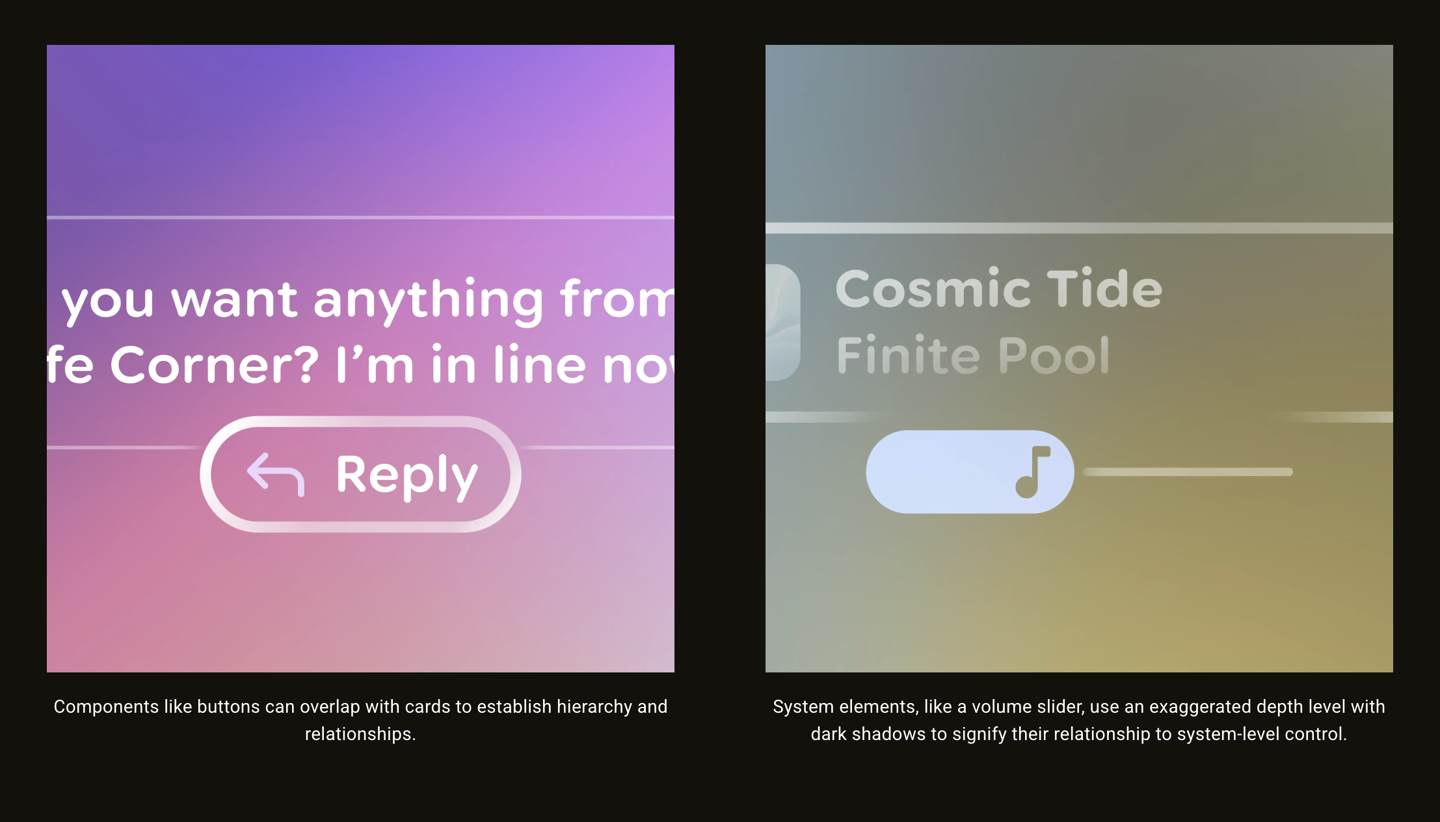 谷歌高等视觉蓄意师 David Allin Reese 在专文中系统请教了这一蓄预见路。与苹果 visionOS 承袭有色与磨砂玻璃质感、通过对比增强可见性的格调不同,谷歌更强调“将界面置于手臂长度除外”的理念。界面元素仿佛悬浮在视线前哨,而不是贴附在试验寰宇之上。