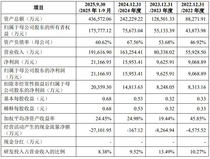 财务方面,于2022年度、2023年度、2024年度及2025年1-9月,公司已毕贸易收入差别约为5.59亿元、8.03亿元、16.33亿元、19.16亿元东说念主民币;同时,净利润差别约为9068.89万元、9625.91万元、1.6亿元、2.12亿元东说念主民币。