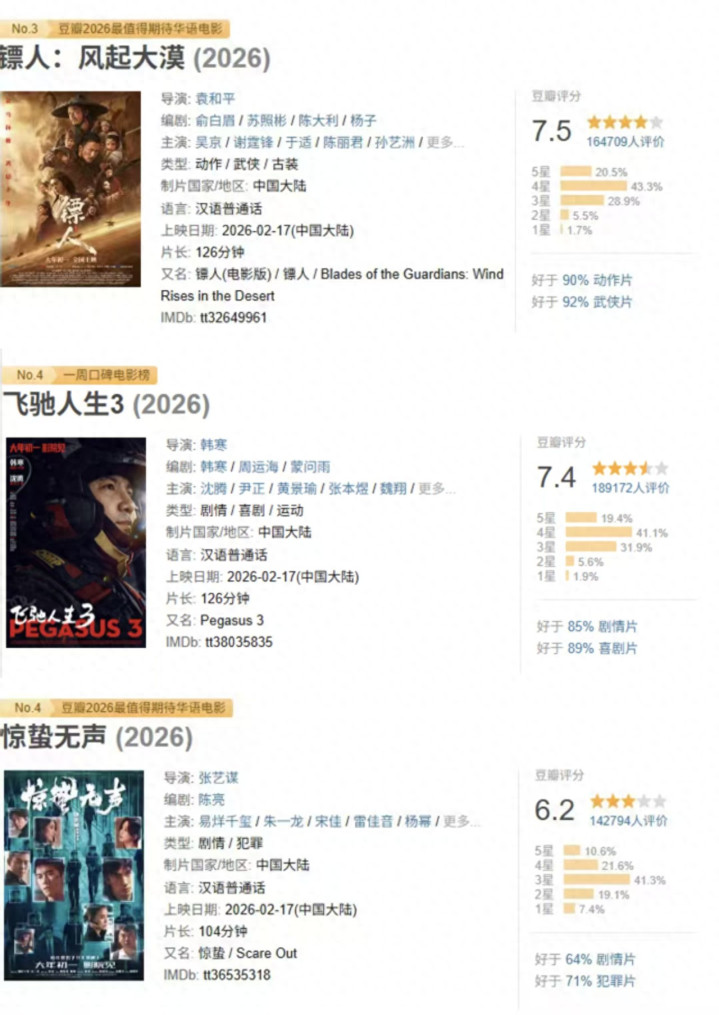 《镖东说念主》《奔驰东说念主生3》这两部评分都在7.5、7.4傍边。
