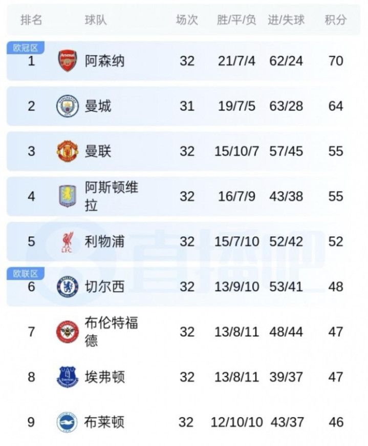 现在阿森纳、曼城两队争冠暂时莫得分出上下,不外他们详情会拿到一个门票的。排第三的曼联,及接下来的阿斯顿维拉分数相同,第五的利物浦比第三的曼联只是差了3分,再往后切尔西、布伦特福德、埃弗顿、布莱顿分数差唯有2分,赛事还剩下6轮认为18分,这三个履历到底包摄谁,很难讲。