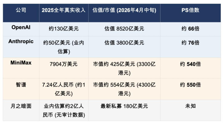 把它推到这个位置的,不是它我方,是身边那两家照旧上市的同业。智谱1月8日敲钟,MiniMax 1月9日敲钟,到四月中旬,智谱涨了近700%,MiniMax涨了480%。按2025年全年真实收入算,两家的市销率高达540到550倍,是OpenAI(66倍)和Anthropic(76倍)的七到八倍。