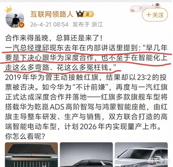要知说念,在2019年华为去找一汽红旗合营的时候,一汽引导层以“23票反对、2票传颂”隔断了与华为的合营。